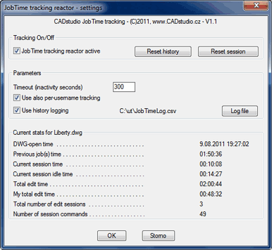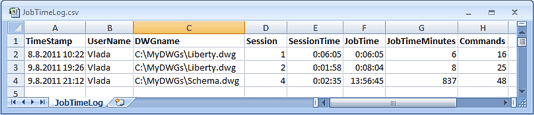 JOB-TIME is a time-tracking reactor for Autodesk® AutoCAD® (any version), which automatically logs true (net) editing time spent in the current AutoCAD drawing. Idle periods (longer than the defined timeout) are not counted in the tracked time. Time information is stored inside the DWG file (in drawing properties) and logged into a TXT or CSV (Excel) file.