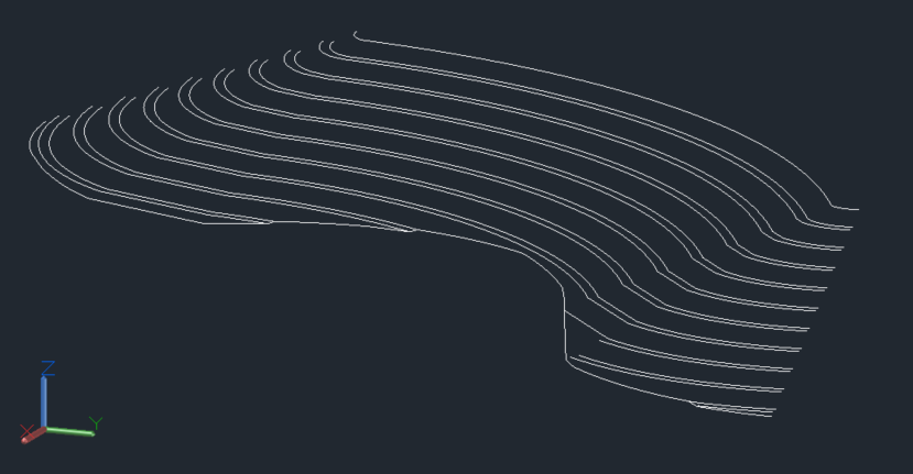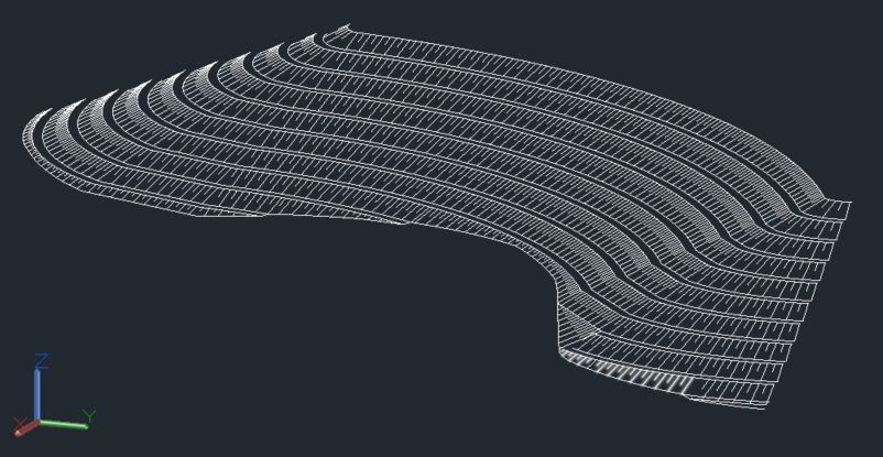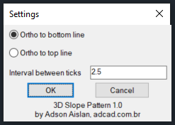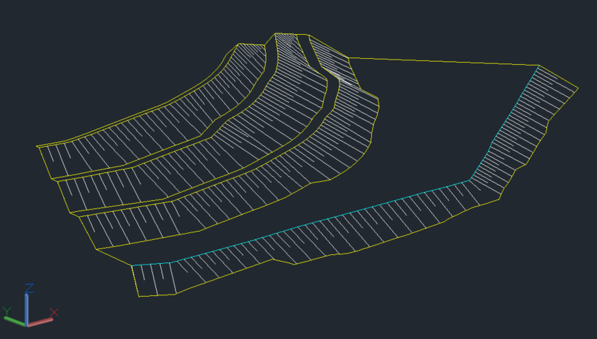 Draw the slope pattern between two polylines. Through a dialog box, you can define whether the pattern will be orthogonal to the bottom 3D polyline (usually in cut slopes) or top 3D polyline (usually in fill slopes), and the distance between pattern ticks.
