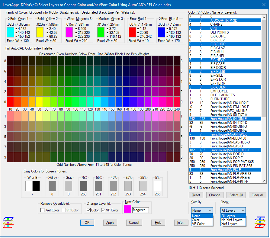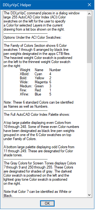 (6) DDLyrVpC - Places in a list box Layer Names to Change to a different Color selected from large 255 Color Swatches.
