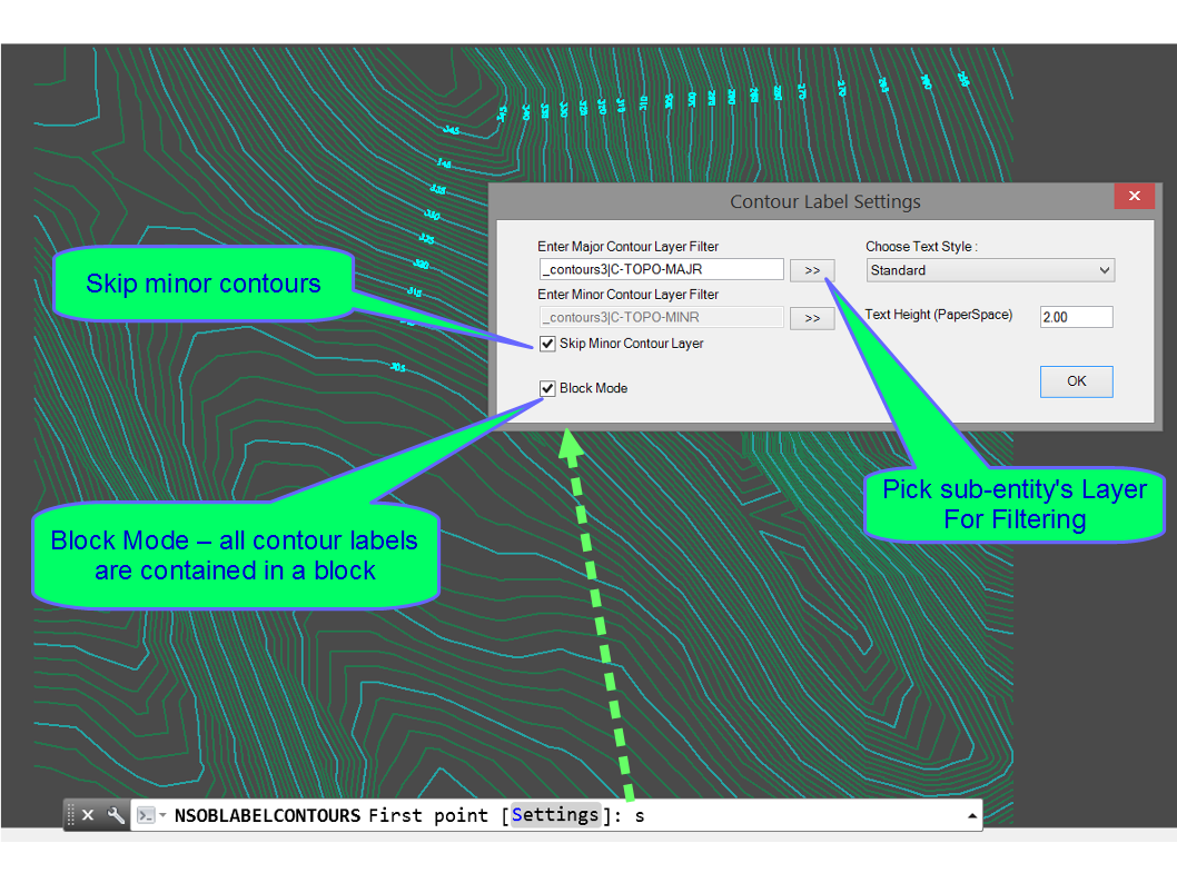 Tweak the Settings to "Block Mode" and allow the labels to be placed in a block for easier manipulation. Settings also allow for skipping minor contours using their layers, provided that minor and major contours are in different layers.
