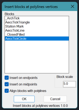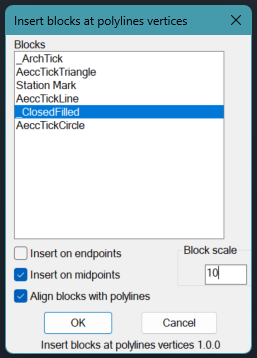 This app allows you to insert blocks at the endpoints and midpoints of polylines. You can select as many polylines as you want to insert the blocks. After choosing the polylines, set your preferences in the dialog box.