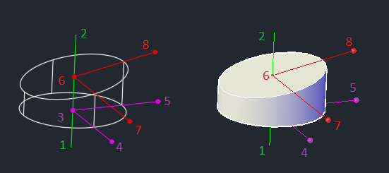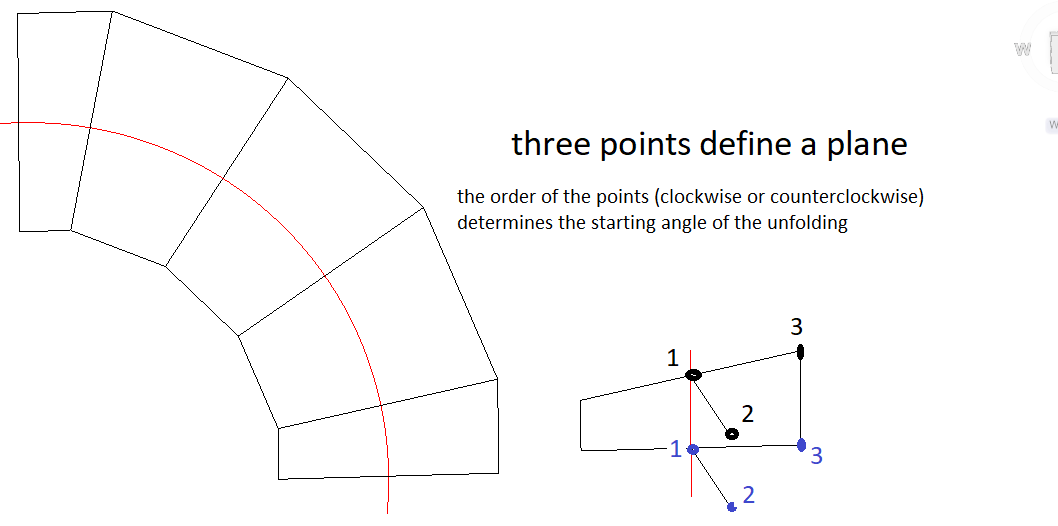 You can extend an entire knee segment or a separate segment from it or any cylindrical segment (part of a cylinder bounded by two arbitrary planes). Planes and axes are selected by selecting points. Three points define a plane. Two points define a line. The order in which the points are selected (clockwise or counterclockwise) is important for the initial unfolding angle.