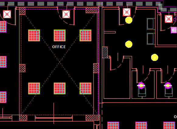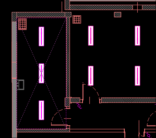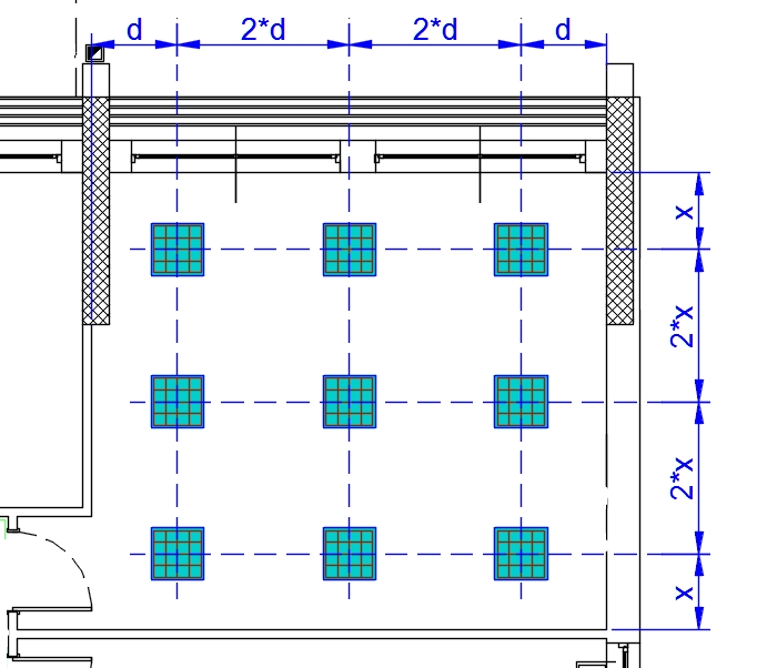 Light Distribution distributes the blocks of lighting fixtures or other ceiling-mounted appliances in a room according to the rule that: the distance between the elements is twice the distance between the elements and the walls of the room.
