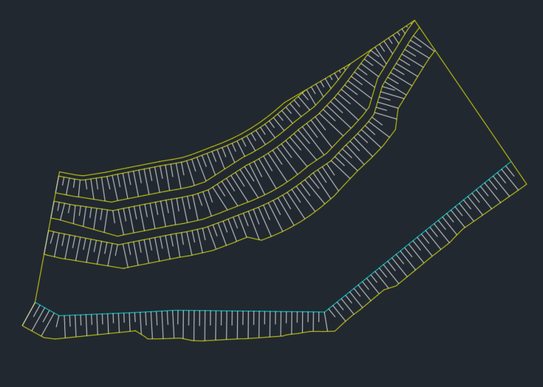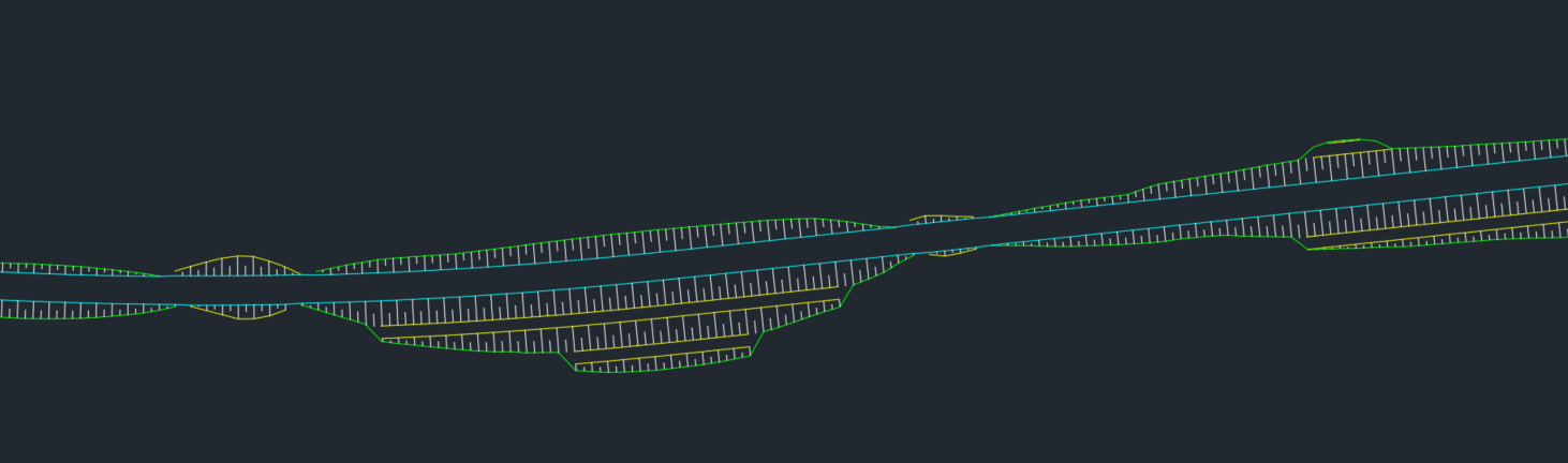 Draw the slope pattern between two polylines. Through a dialog box, you can define whether the pattern will be orthogonal to a bottom polyline (usually in cut slopes) or top polyline (usually in fill slopes), and the distance between pattern ticks. Also, you can choose to consider benching. In this case, define the planned distance between the bench and the planned width of bench, and the pattern will be drawn considering bench, as in the example screenshots.