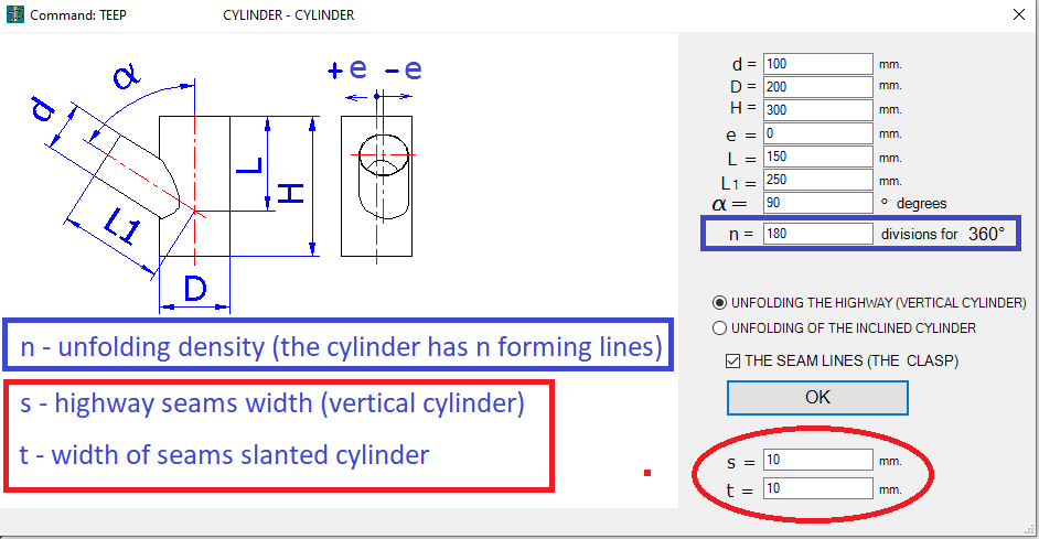 Allowances may be left for fastening, and Dimensions can be set manually in the form fields or selected from the drawing. A help file can be called (there are specific buttons).
