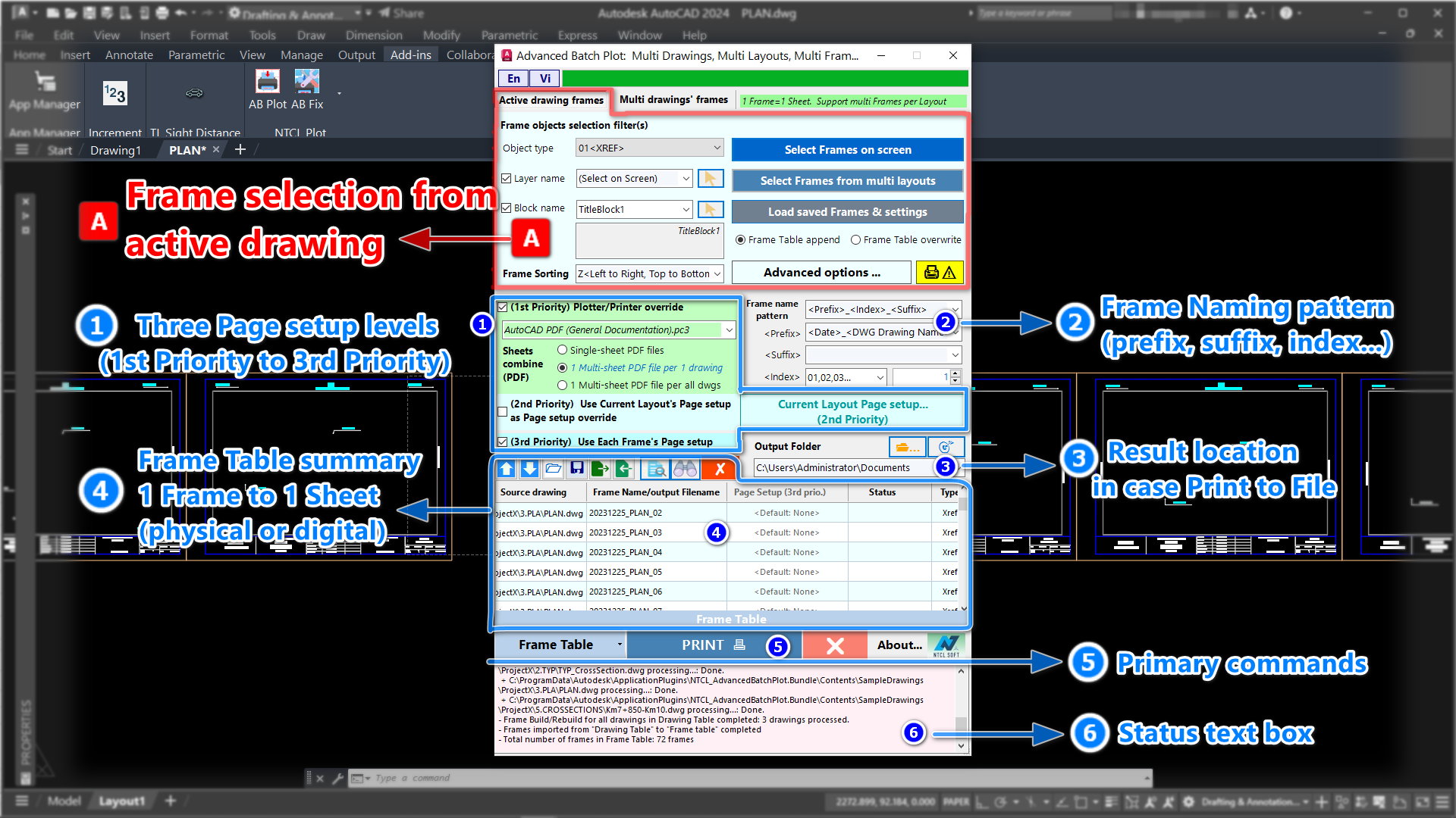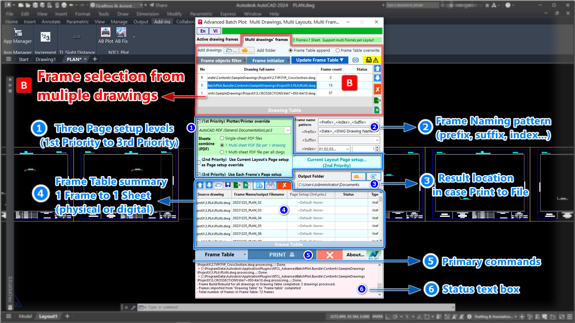 5. Advanced Batch Plot: Plot/ Print multi drawings, multi Layouts, and multi sheets per Layout. The printing configuration of each drawing is automatically saved. Sheets may be auto-combined into one PDF file with Bookmarks. Auto turn on/ turn off paper space Viewports. Auto ignores null content sheets. Read the sheet list from Autodesk® AutoCAD®.DST and .DSD files.