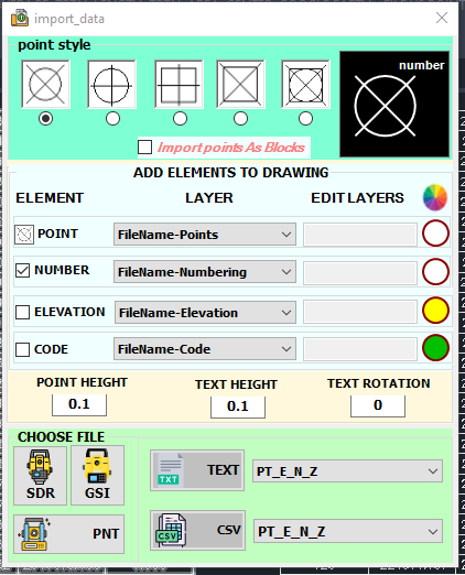 Import Options: Seamlessly bring in data from total station txt/sdr/gsi formats. Users can customize point height, text height, and rotation angles for texts during import.