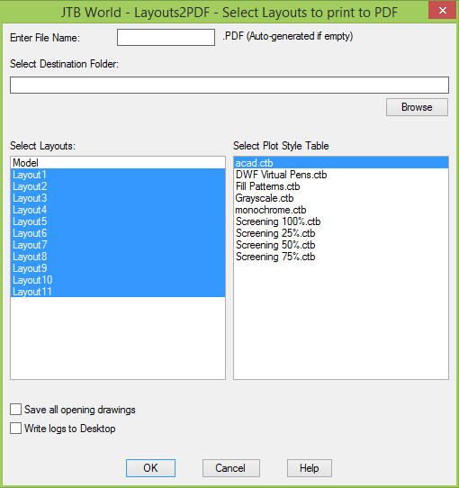 JTB Layouts2PDF helps you print selected layouts with selected plot style to one PDF file. Your current Page Setup on each layout will be used.