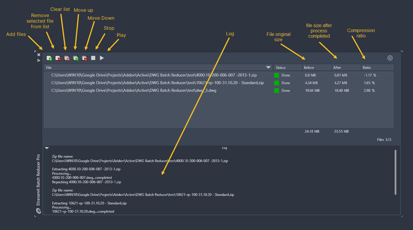 Now it's simpler than ever to access all your .dwg files inside an ETransmit package and reduce their size quickly and safely, just add your files to the list, hit Play, and see the magic happen.