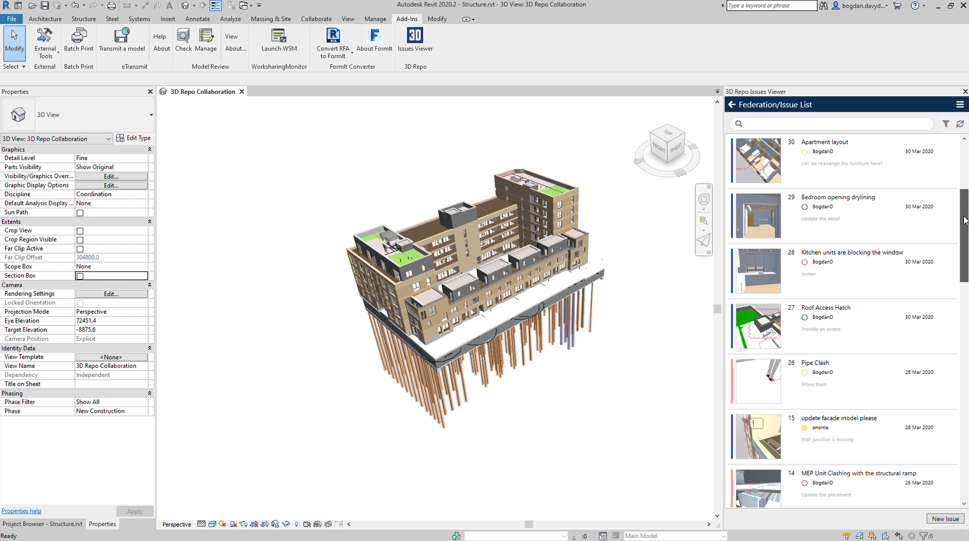 View messages, resources, screenshots, and even add new issues and comments all from within your standard Revit view. Any new issues and comments are then easily synchronized back to Asite 3D Repo for other collaborators to address.