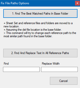- Fix File Path: If you move your project files, restructure the folders, you may find that in your SheetSets, many file and folder paths are marked as missing or not found. Click this command button will help you fix the issue. Assuming the dst file is in the out-most folder, the app will try to find all missing files and folders paths inside the dst file's folder structure.