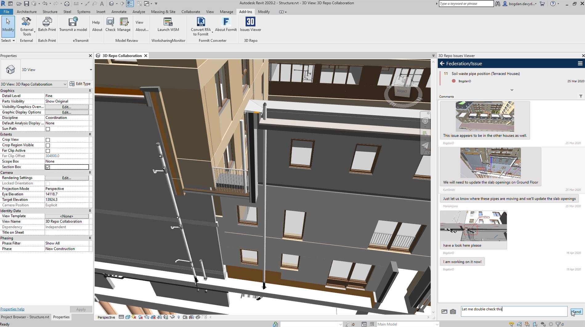 View messages, resources, screenshots, and even add new issues and comments all from within your standard Revit view. Any new issues and comments are then easily synchronized back to Asite 3D Repo for other collaborators to address.