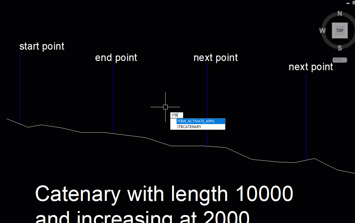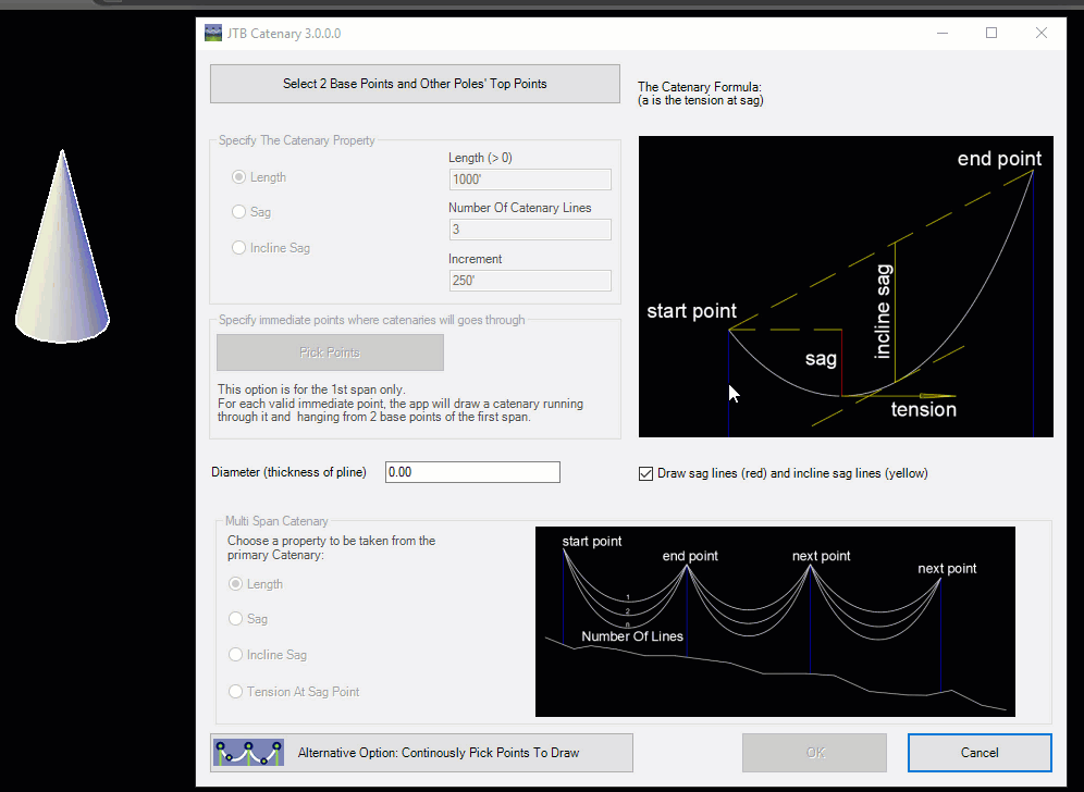 From JTB Catenary Version 3.0, you can draw multiple catenaries with length or sag or incline sag increasing. You can also draw a multi-span catenary by picking more than 2 points. If your picked points have Z coordinates, it is assumed that the catenary will be hanging down in 3D space, and the catenary will be drawn in 3D.