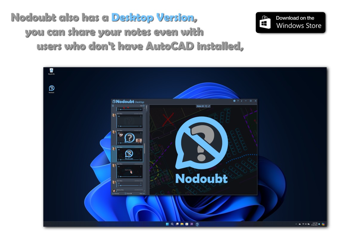 Nodoubt goes beyond AutoCAD, offering a desktop version for users who neither have AutoCAD installed on their machines nor knowledge of CAD tools. This allows everyone to easily view and add notes and descriptions, record audio, and create slides with markups, making information distribution easier. You can download Nodoubt Desktop from the Windows Store for free.