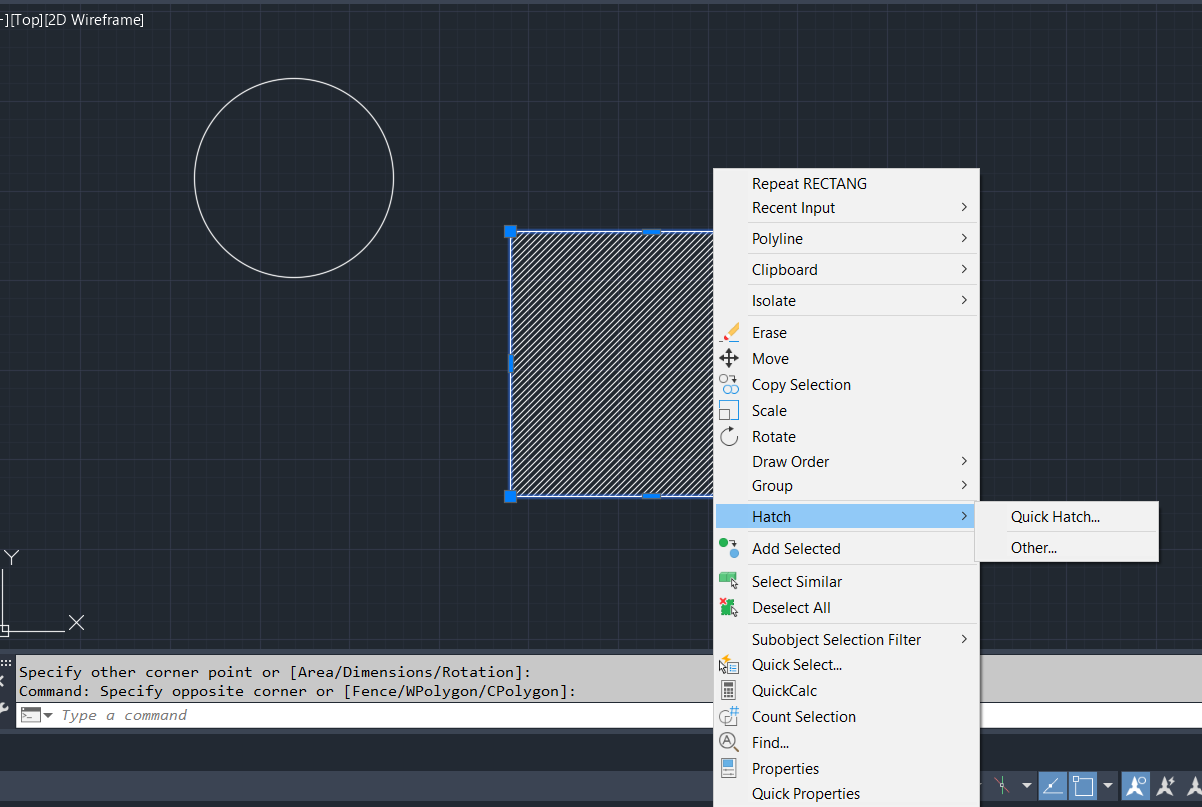 The Quick Hatch... menu item supports current hatch defaults as defined in the various HP*, and CE* system variables. The Other... menu item will prompt the user for a hatch pattern from the standard hatch pattern dialog, scale, and rotation angle. Both menu items support UNDO functionality.