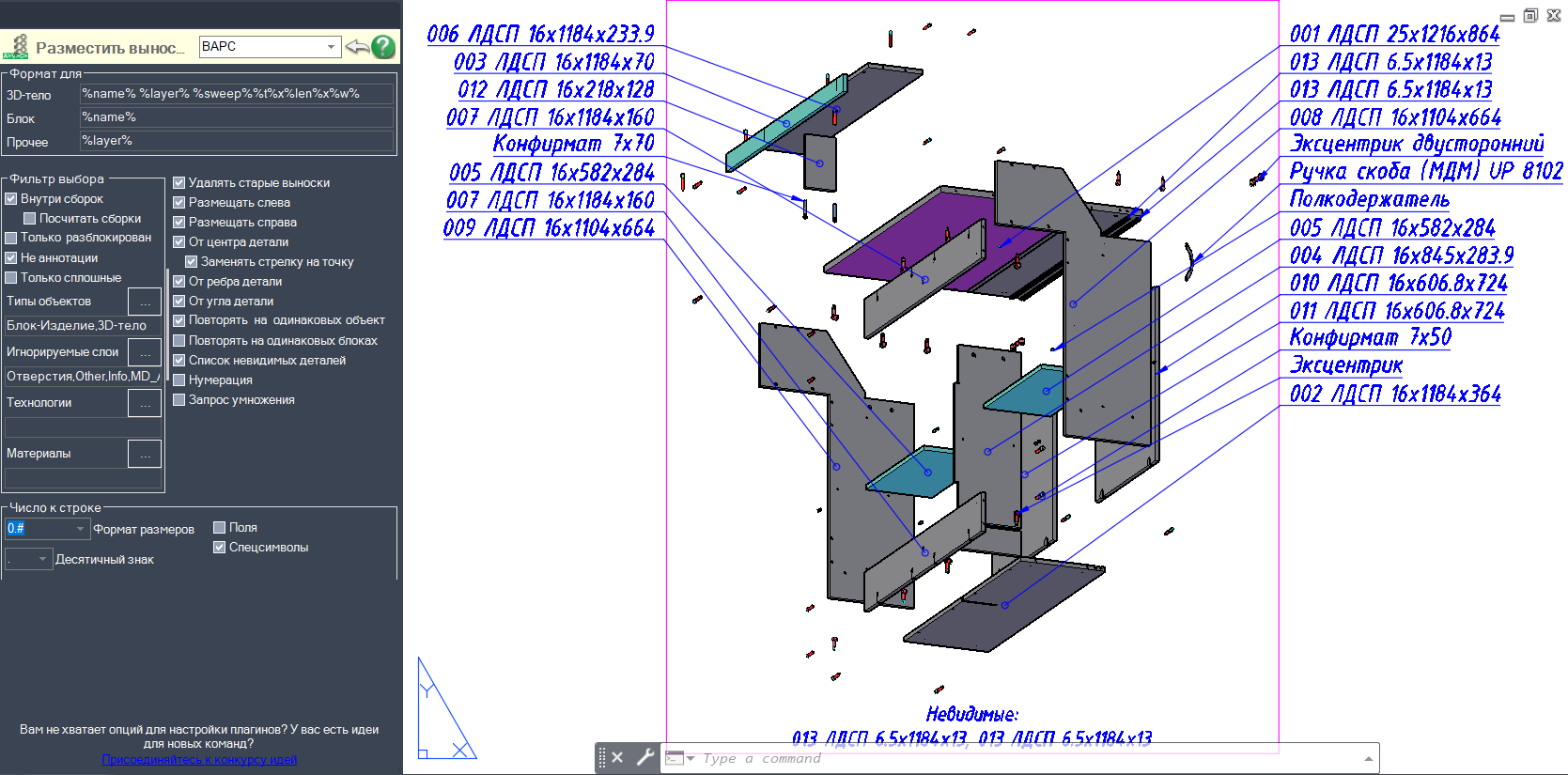 The "Place Leaders" command will help you quickly arrange assembly drawings. The command will create a callout (multileader) from each visible part or from each block, extract the name of the part or any other data about it, and arrange the MultiLeader texts in two columns on the sides of the assembly. Thus, all the work on creating all callouts is done in one click. You can use the command in 3D or 2D drawings, in viewport sheets, or directly in the model. Using the program ensures that you do not forget to mark any details.