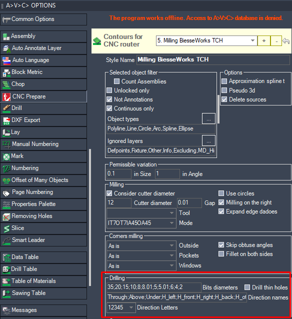 Substitutions: new %number% substitution for CNC-drill-contours = the program numbers all drills in order of their diameter and location. Substitution has been added to the default settings for the Drill Table. Substitutions fixed: %drill% (directions of lateral drilling) from h_back and h_front were confused. Fixed a bug in AutoCAD 2025 when opening the substitution input window. |
