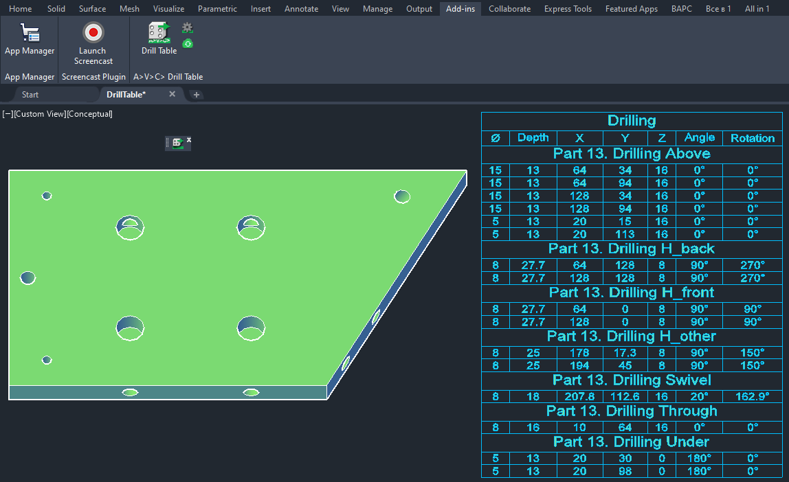 Select the part and call the DrillTable command. You can select several parts at once - in any case, a single table will be created. You can select a viewport or multiple viewports, in which the laid out details are visible. You can add an empty table to the selection that you want to fill - then the program will not ask you to select a table.