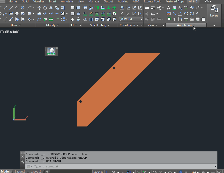 There are 2 options for using the command - in model space and on a layout. If you want to dimension the model, start by setting the correct user coordinate system (UCS). Most often the world coordinate system (UCS W) or a user-defined coordinate system on the face of the solid (UCS F) is used. Dimensions will be placed in the XY plane of the current coordinate system.