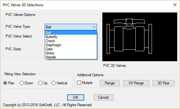 PVC Valves 3D allows the user, without having to change the UCS to easily place valves in various 3D views by selecting one of the toggles on the dialog. Valves are inserted with the valve handles on the side, top, or bottom of the valve body or in a vertical position based on the toggle selected. The 3D pipe can also be easily drawn to the size selected.