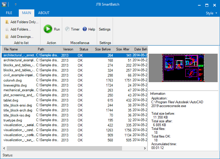 JTB SmartBatch is useful if you want to minimize the size of files before a backup or before sending drawings by e-mail, burning to CD or just to use as a quick viewer of drawings. You have options to save the files to a separate folder or to a different drawing version.