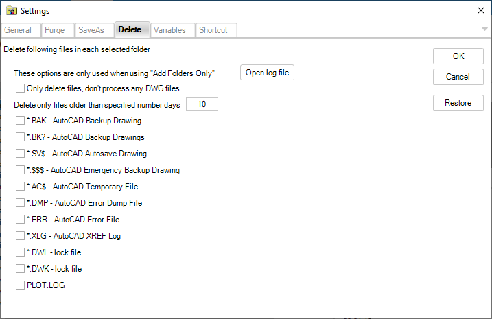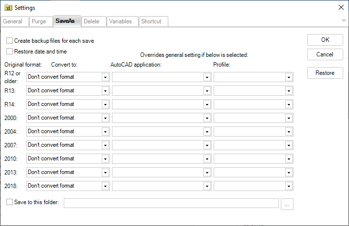 You can run the audit, zoom extents, and create preview icons. Convert between versions. Purge Blocks, Dimension styles, Layers, Linetypes, Mline styles, Shapes, Text styles, Plot styles, Page Setups, Filter states, Layer states, Layer manager states (Express Tools), Line objects without length, Text objects without text, embedded VBA code, registered applications collections, Anonymous Groups, Groups, Orphaned Data. It's possible to restore the date and time of the file to what it was before the scripting. Delete.BAK and other temporary or garbage files and much more. Remember that this is a very powerful tool and make sure you understand and know what you do when you use it. Read the documentation before you run it. Try on some test files/folders as a start. To be on the safe side make sure you have backups before you run.