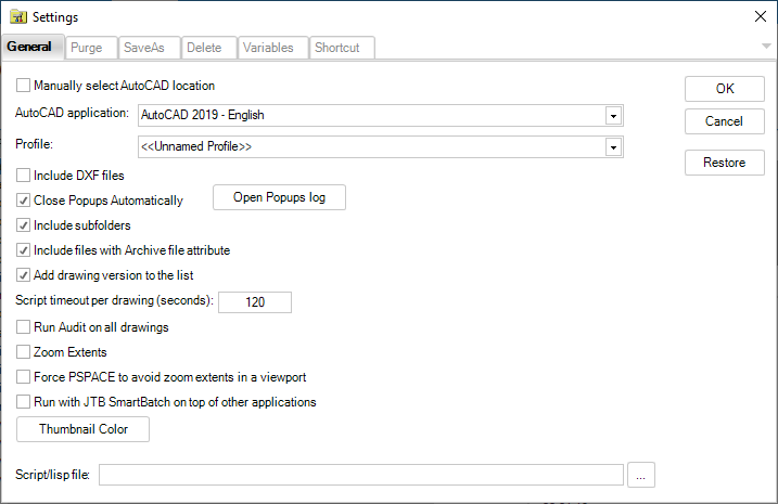 JTB SmartBatch (aka SmartPurger) is a batch and script utility for processing multiple Autodesk® AutoCAD® drawings with full control. Execute LSP or SCR files on multiple drawings. JTB SmartBatch handles crashes so the batch processing continues to the end and leaves bad drawings to be corrected manually. Many purges and cleanup settings are available. Useful before backups and distribution of drawings. The file's modified time stamp can be restored.