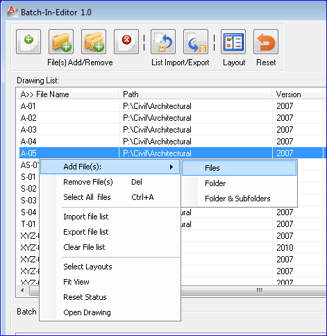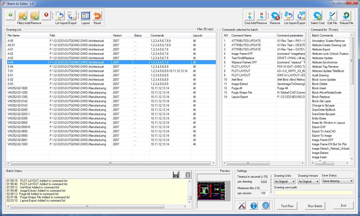 BatchInEditor takes Autodesk® AutoCAD® batch process to a new level with powerful built-in commands and an easy-to-use interface. It comes from years of experience in AutoCAD, and it is one of the AutoCAD Productivity tools developed by CADManagerTools.com.