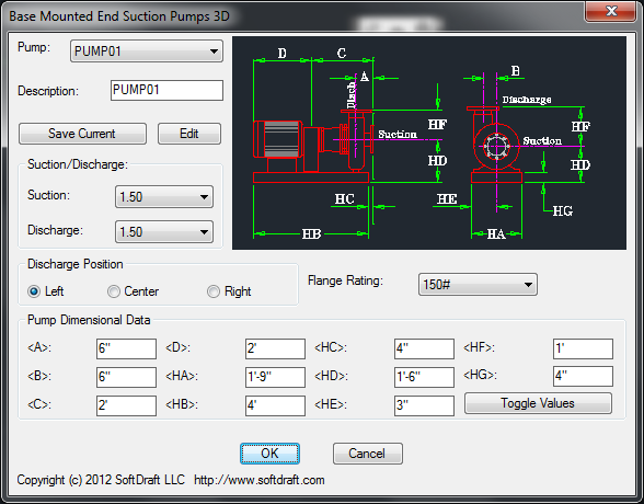 Base Mounted End Suction Pumps create a wide variety of 3D pumps from pump manufacturer data sheets, by inputting the dimensional data for each pump dimension. Dimensional data may be saved for future use and then recalled in a different drawing file. Three different discharge positions include left, center, and end. Suction and discharge selections range from 1/2" up to 42".