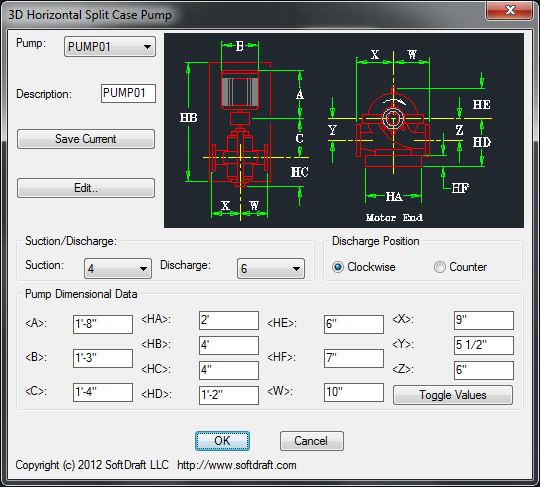 Horizontal Split Case Pumps creates a wide variety of 3D pumps from pump manufacturer data sheets, by inputting the dimensional data for each pump dimension. Dimensional data may be saved for future use and then recalled in a different drawing file. Two different discharge positions include clockwise and counter clockwise. Suction and discharge selections range from 1" up to 14".