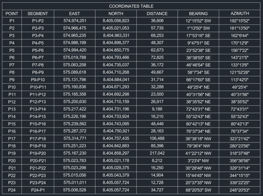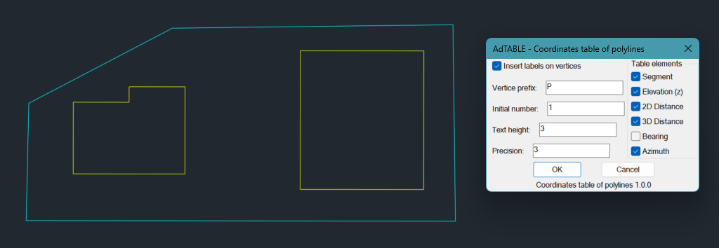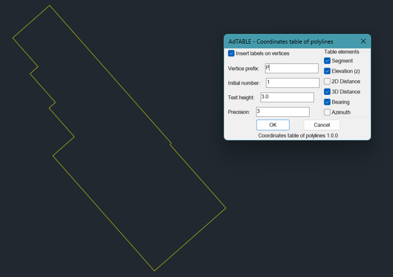 This app generates a coordinate table for polylines and 3D polylines. Using a dialog box, you can select whether to add labels to the objects and choose the information to include in the table: Segment, Elevation, Distance, 3D Distance (enable if there are 3D polylines on the selected objects), Bearing, and Azimuth. Each selected option adds a corresponding column to the table. The fixed columns are Point, East, and North. For the labels, you can configure the prefix, initial number, and text height. You can also set the precision for table data.