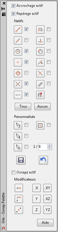 La commande GILE_OSNAPPALETTE affiche la palette d'accrochages aux objets qui combine les cases à cocher de la boite de dialogue OSNAP pour paramétrer les accrochages permanents (éventuellement de manière transparante) et le menu Accrochage aux objets pour spécifer un modificateur de commande (accrochage, filtre de point, milieu de deux points) à l'invite pour spécifier un point.