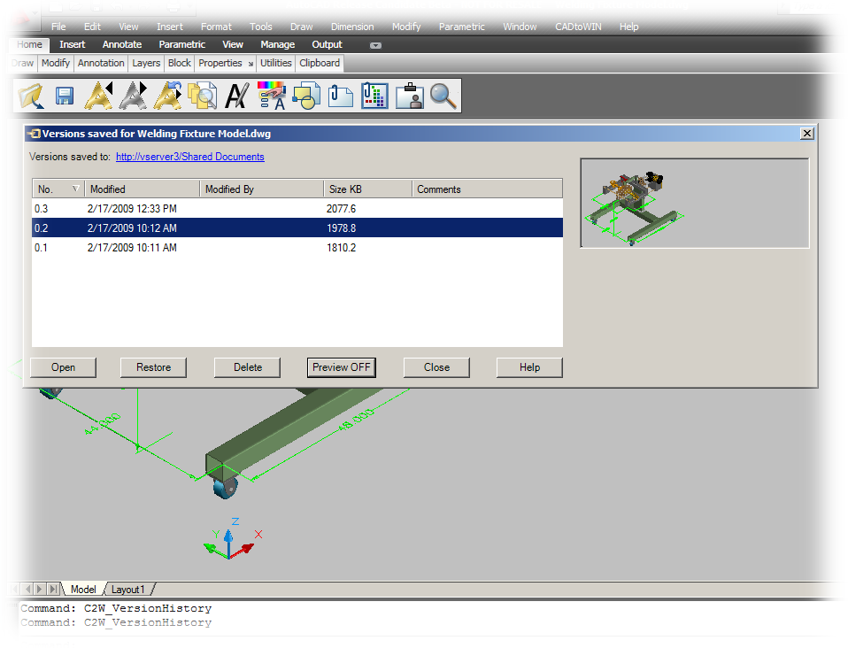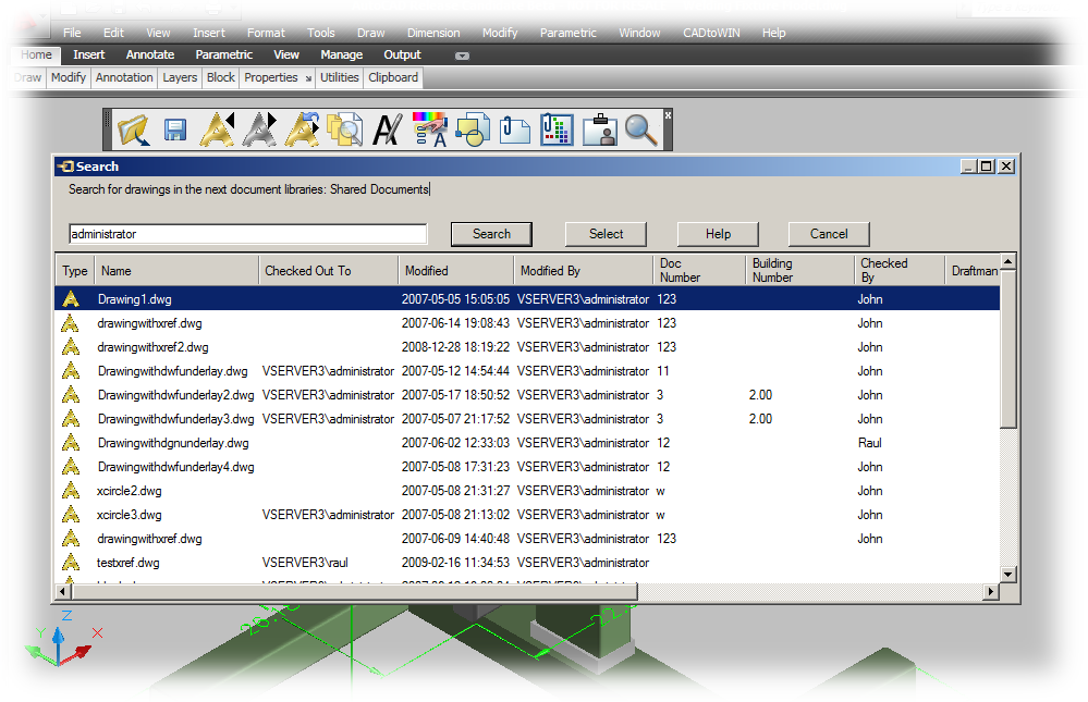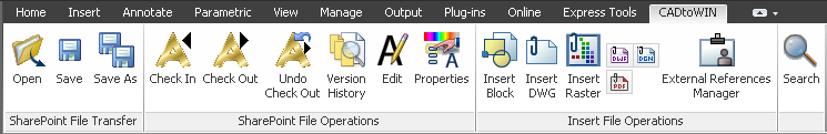 CADtoWIN enables AutoCAD drawings to be opened, saved, checked online/offline out, versions history view, and checked into the SharePoint Services document Library environment, and all such operations work within your familiar AutoCAD-based application. In addition, CADtoWIN supports your drawing associated with external reference files placed on your SharePoint site. With CADtoWIN, you can have the benefits of an Enterprise Document Management System (EDMS) at a very small fraction of its normal cost.
