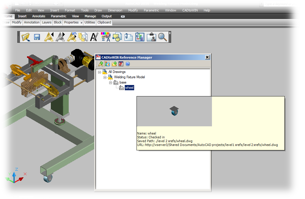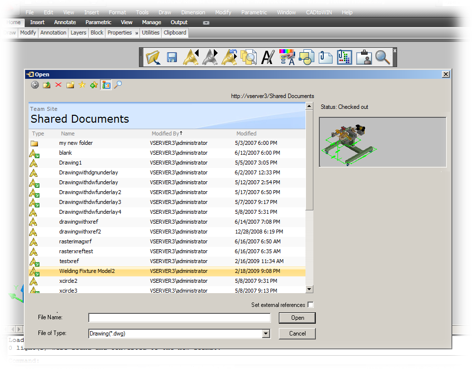 - Support for loading, inserting, and mapping external reference files within your CAD application, so you can organize all of your CAD project files to your SharePoint site.