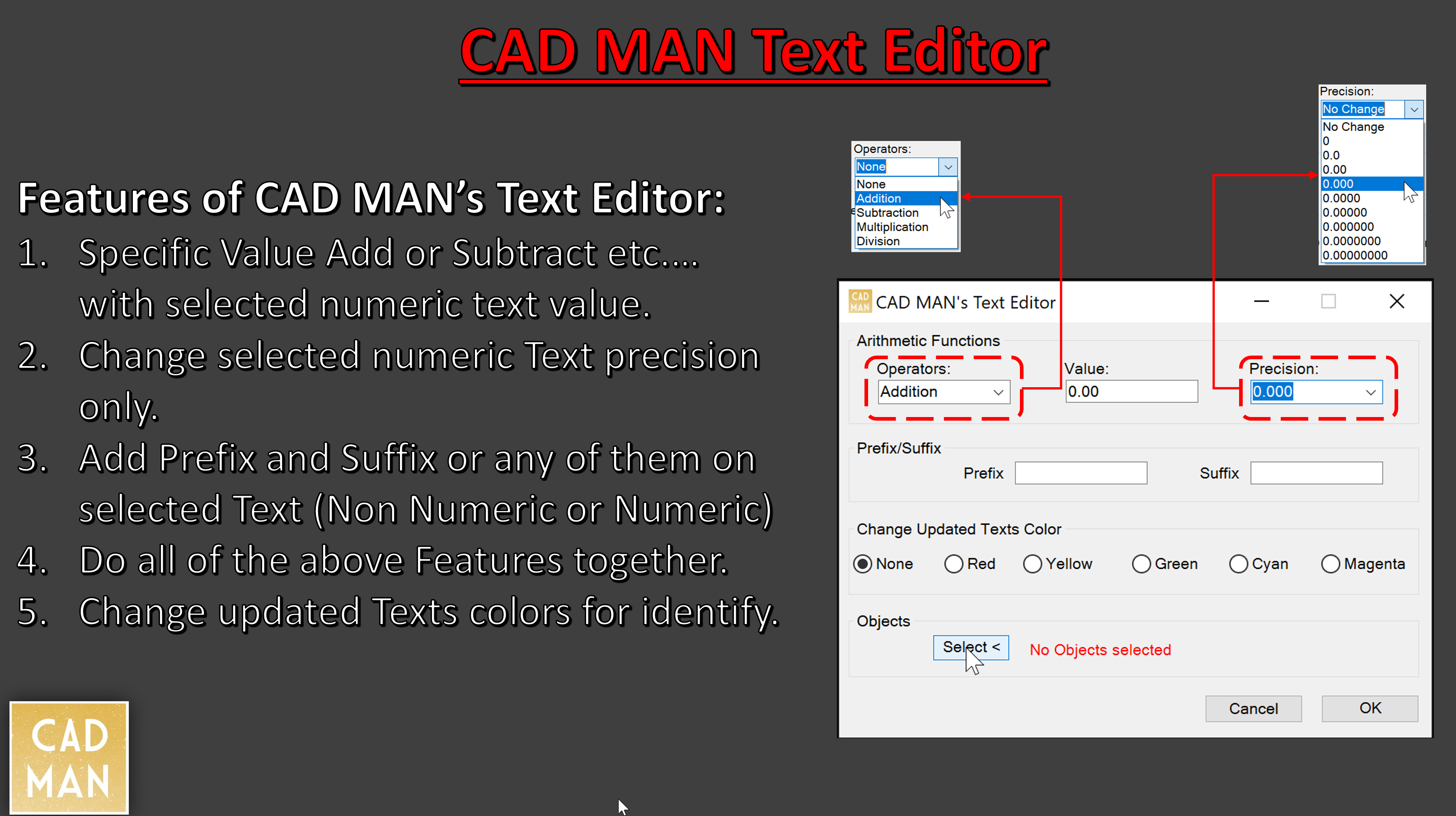 This app will help you to edit all the selected texts by using an arithmetic calculation. The text value precision can be changed. You can also add a prefix and suffix if required. For identification, the updated texts can change into the selected color. This app will work for both Text and Mtext.