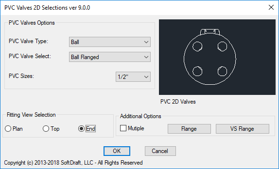 PVC 2D Valves allows the user to place valves in various 2D views by selecting one of the toggles on the dialog. Valves are inserted in different views - plan or side, top, and end view.