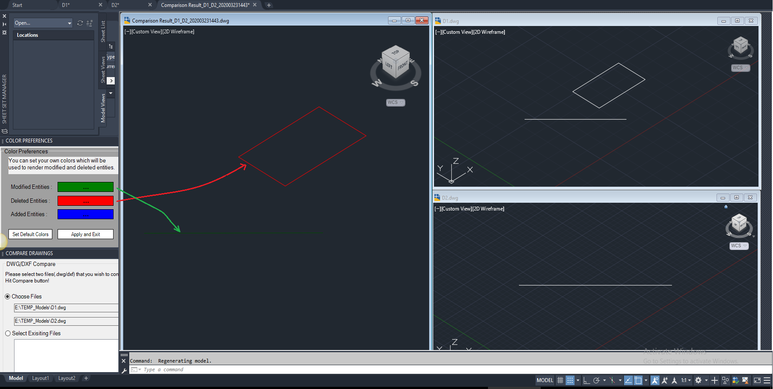- The plugin compares two DWG/DXF files and highlights the differences in the output DWG file using default color codes:
