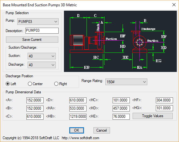 Base Mounted End Suction Pumps create a wide variety of 3D pumps from pump manufacturer data sheets, by inputting the dimensional data for each pump dimension. Dimensional data may be saved for future use and then recalled in a different drawing file. Three different discharge positions include left, center, and end. Suction and discharge selections range from 15mm to 600mm.