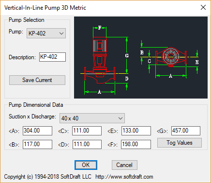 Vertical In-Line Pumps creates a wide variety of 3D pumps from pump manufacturer data sheets, by inputting the dimensional data for each pump dimension. Dimensional data may be saved for future use and then recalled in a different drawing file. Suction and discharge selections range from 40x40mm to 300x300mm.
