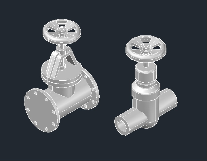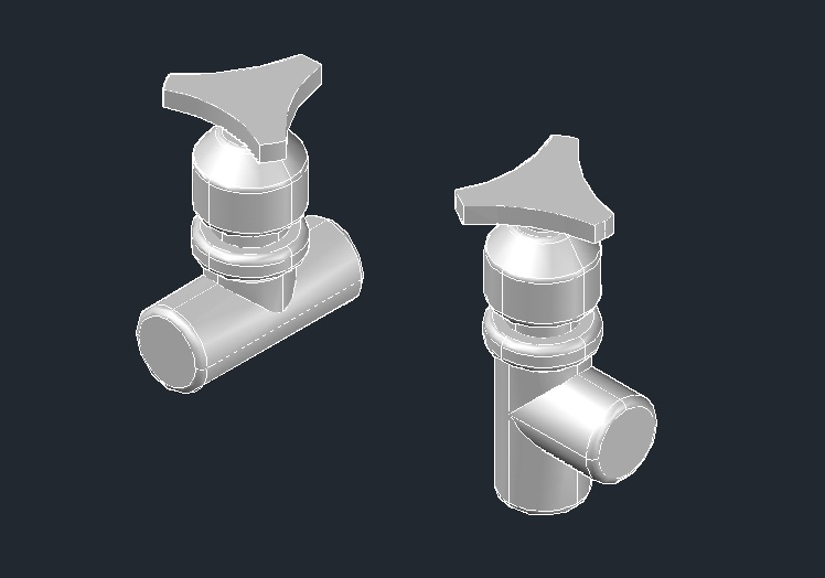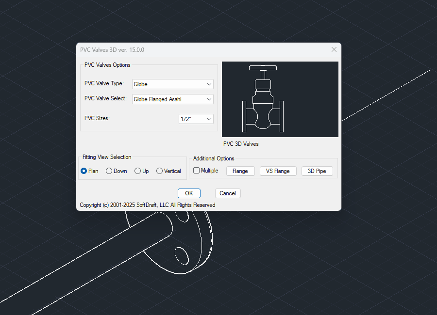 PVC Valves 3D allows the user, without having to change the UCS to easily place valves in various 3D views by selecting one of the toggles on the dialog. Valves are inserted with the valve handles on the side, top, or bottom of the valve body or in a vertical position based on the toggle selected. The 3D pipe can also be easily drawn to the size selected.