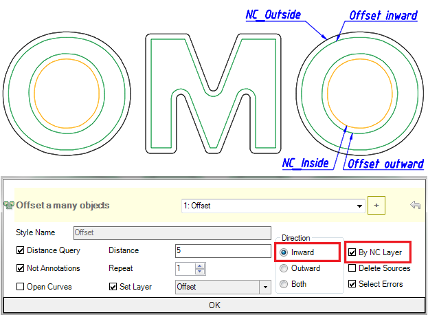 - You can change the offset direction for the internal contours of the part of the contour layers were assigned by the Outside Loop (OSL) or by NC Prepare (NCP).