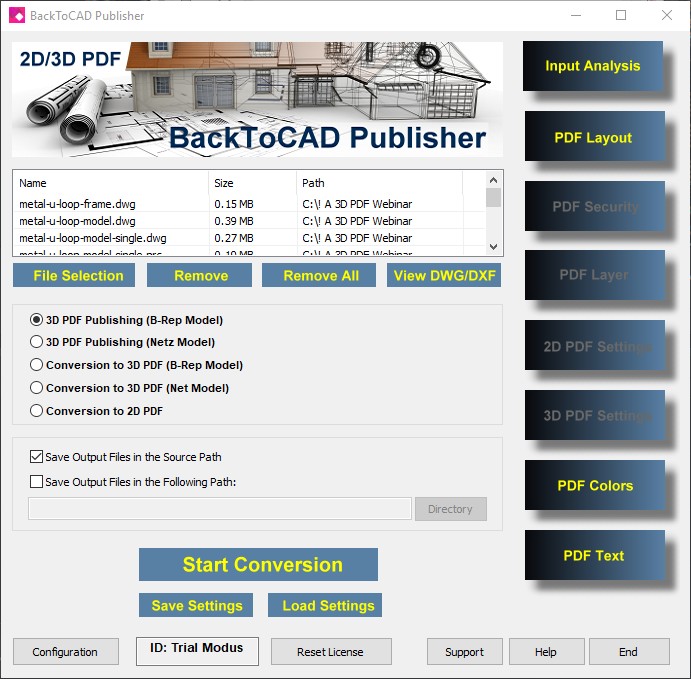 2D PDF, 3D PDF, and PRC (3D PDF or CAD Input).