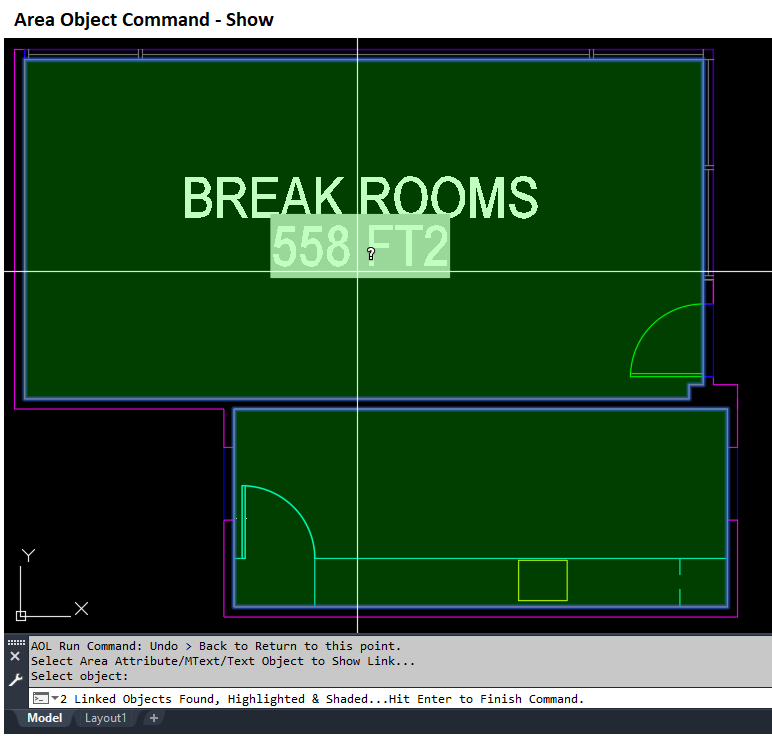 5. Show - allows the user to select an Attribute, MText, or Text with Fields to show the object(s) highlighted & shaded that have linked Area / Perimeter values.