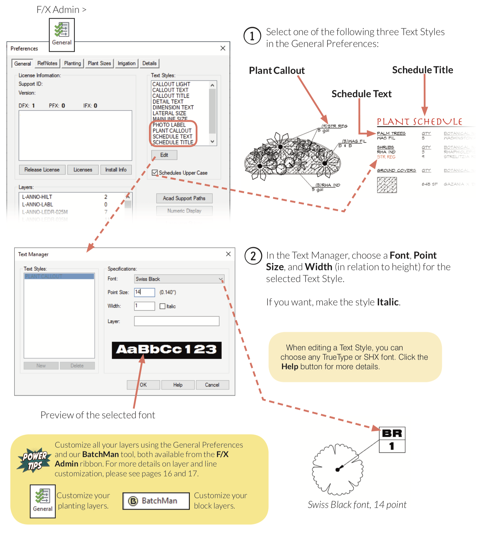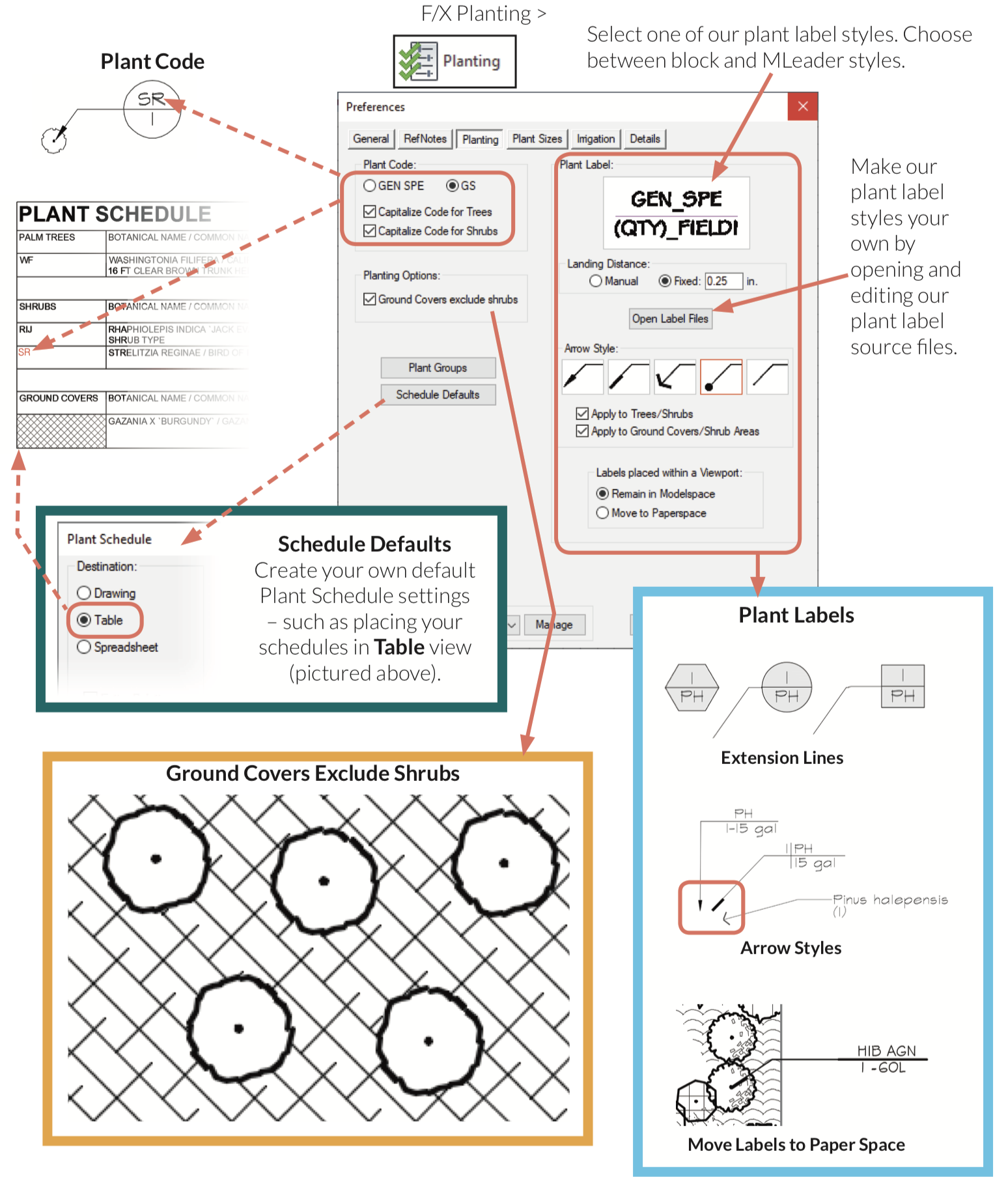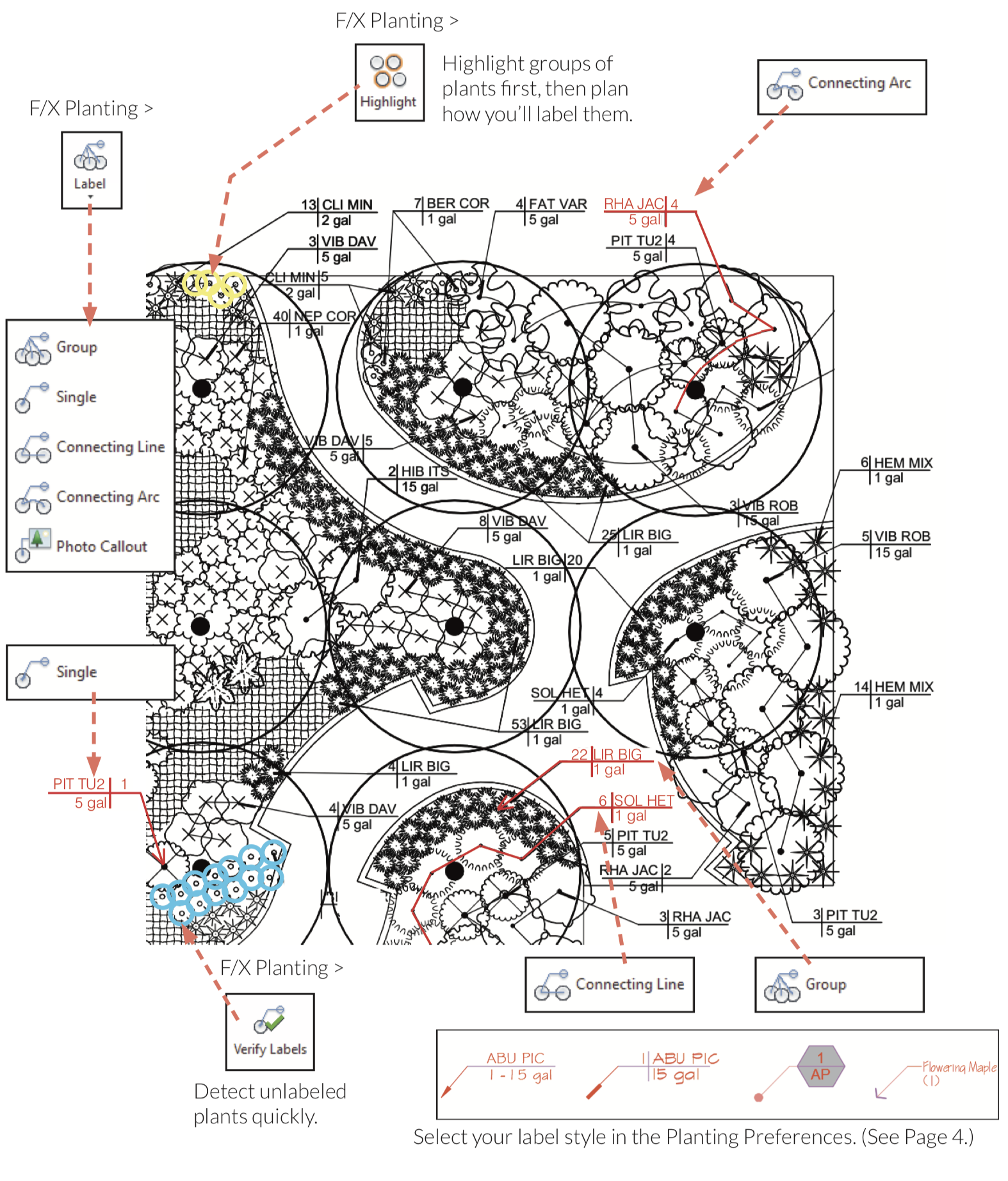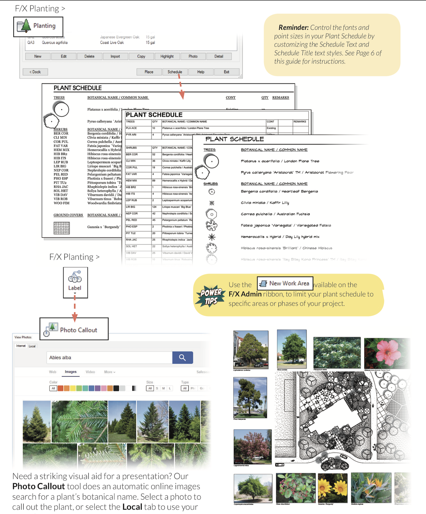 Label your plan quickly and easily. Labels are placed as smart MLeader callouts tied to the plants they identify. Check for errors with a click, and place instant schedules with automatic quantities. Apply your office standards to everything from fonts and layer colors to plant symbols and plant label styles. Never count plants again! Transform your planting plans into color presentations and back into construction documents instantly, and easily move your drawings into 3D models using SketchUp, Rhino, or Autodesk® Revit®.