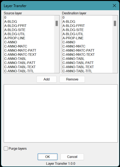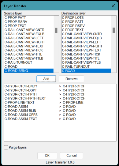 You can define the source and destination layers in an interactive dialog box. Select a source layer from the list on the left and a destination layer from the list on the right. Click the Add button to save the setting, and repeat this process as many times as needed to transfer objects from multiple source layers to the corresponding destination layers.