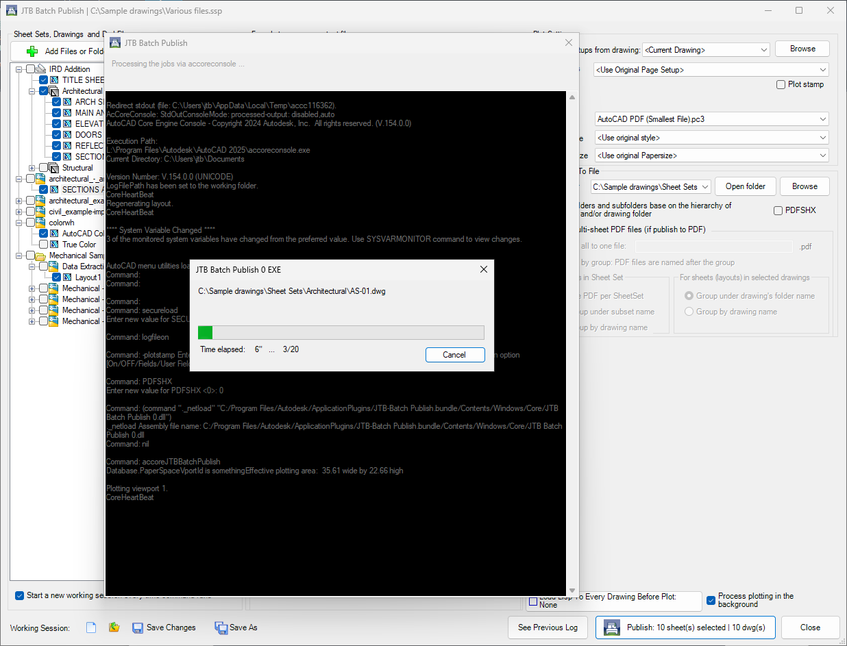 JTB Batch Publish is an app for Autodesk® AutoCAD® that publishes sheets in Sheet Sets or the Project Navigator, layouts in other drawings, folders, or drawings in DSD files to files like PDF, DWF, PNG, or JPG/JPEG. The files created are named as you want based on a naming formula that you specify. Use date fields, block attributes, and/or sheet properties of your choice to build up the output filename. Publishing to printers can be done, too.