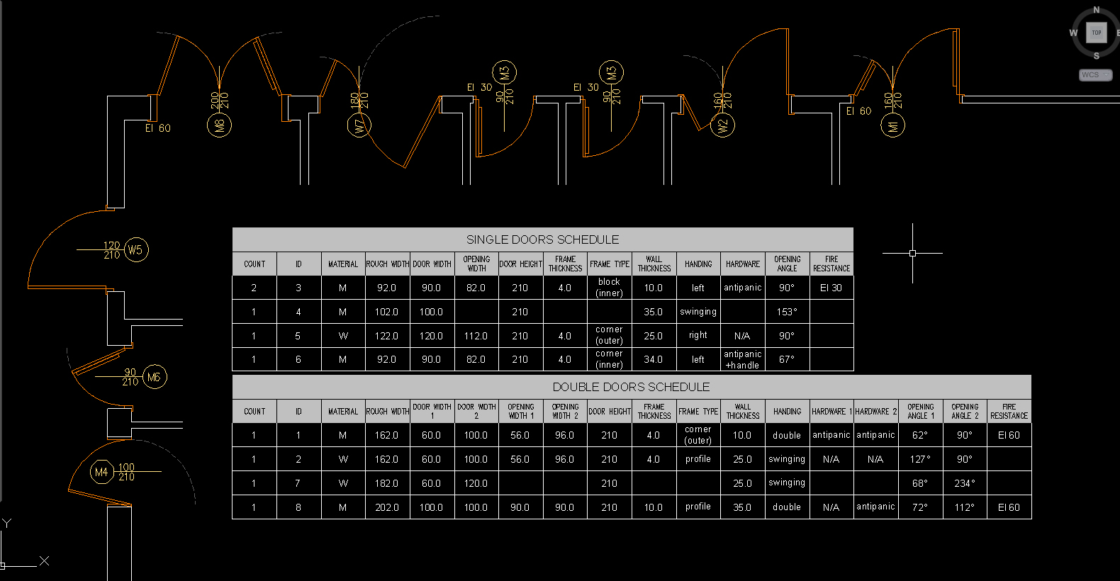 ADS contains two multifunctional blocks - one for single- and one for double-leaf doors. Their dynamic grips allow them to be used for all kinds of doors - with different size, frame type (profile, outer and inner block, outer and inner corner), frame thickness, wall thickness, handing (left, right, swinging), signification if anti-panic hardware is provided for each leaf, opening angle for each leaf, different opening widths for double doors leaves, etc. All these properties are graphically marked and easy to control either with dynamic grips or from the Properties bar. Each door gets a label with its width (automatically generated), height and material (entered by the user) and ID (either automatically generated or user-defined). Light versions of the blocks (without frame type, frame thickness and hardware adjustments) are also provided.