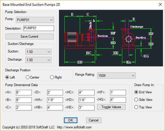 Base Mounted End Suction Pumps create a wide variety of 2D pumps from pump manufacturer data sheets, by imputing the dimensional data for each pump dimension. Dimensional data may be saved for future use then recalled in a different drawing file. Three different discharge positions include left, center, and end. Suction and discharge selections range from 1/2" up to 42". A variety of flange ratings are included.