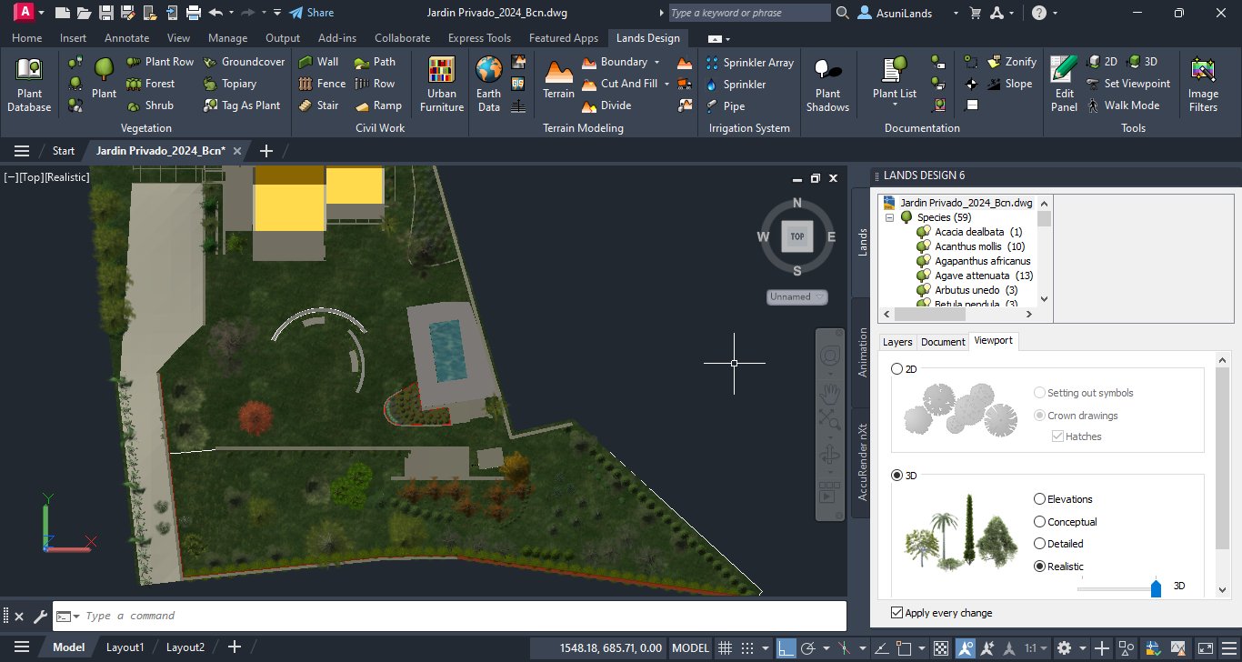 Lands Design is a professional BIM software for landscape design. It lets you develop 2D drawings and 3D technical models of the project while easily switching between 2D and 3D with just one click. By leveraging BIM technology, Lands Design automatically generates quantity takeoff lists of plants, Earthmoving operations, furniture, and other materials. It lets you collaborate easily with other architectural and civil engineering software programs supported by Autodesk® AutoCAD®.