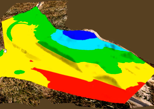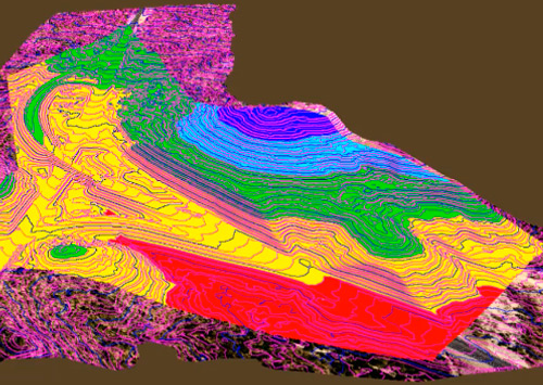 - View the surface by elevation or slope ranges, defining colors and minimum-maximum values for each range, and insert a summary table in the drawing with the corresponding plan view image.